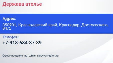 Держава, ателье по адресу 350901, Краснодарский край, Краснодар, Достоевского, 84/1 в дальнейшем Организация, размещена в следующих категориях: