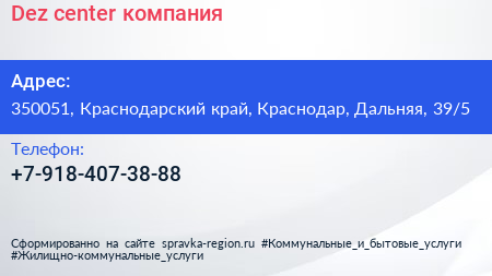 Dez-center, компания по адресу 350051, Краснодарский край, Краснодар, Дальняя, 39/5 в дальнейшем Организация, размещена в следующих категориях: