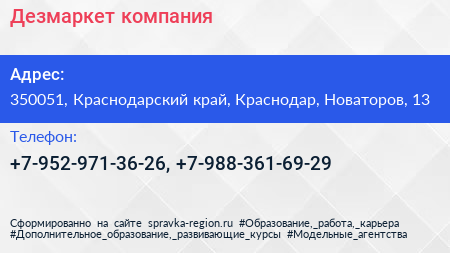 Дезмаркет, компания по адресу 350051, Краснодарский край, Краснодар, Новаторов, 13 в дальнейшем Организация, размещена в следующих категориях: