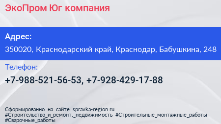 ЭкоПром-Юг, компания по адресу 350020, Краснодарский край, Краснодар, Бабушкина, 248 в дальнейшем Организация, размещена в следующих категориях: