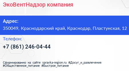 ЭкоВентНадзор, компания по адресу 350049, Краснодарский край, Краснодар, Пластунская, 12 в дальнейшем Организация, размещена в следующих категориях: