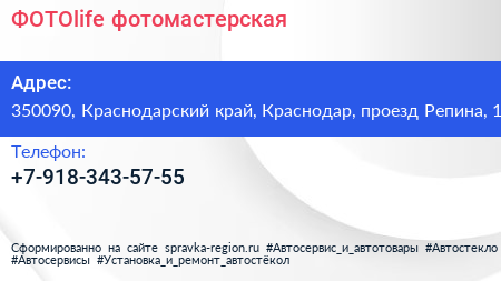 ФОТОlife, фотомастерская по адресу 350090, Краснодарский край, Краснодар, проезд Репина, 1 в дальнейшем Организация, размещена в следующих категориях: