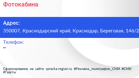 Фотокабина по адресу 350007, Краснодарский край, Краснодар, Береговая, 146/2 в дальнейшем Организация, размещена в следующих категориях: