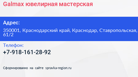 Galmax, ювелирная мастерская по адресу 350001, Краснодарский край, Краснодар, Ставропольская, 61/2 в дальнейшем Организация, размещена в следующих категориях: