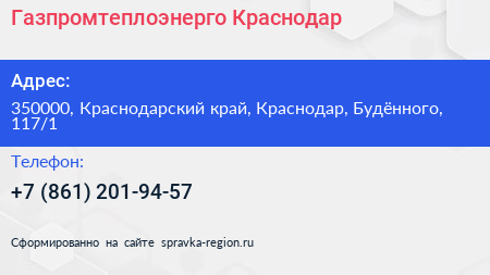 Газпромтеплоэнерго Краснодар по адресу 350000, Краснодарский край, Краснодар, Будённого, 117/1 в дальнейшем Организация, размещена в следующих категориях:
