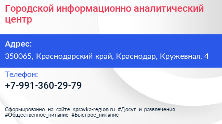 Городской информационно-аналитический центр по адресу 350065, Краснодарский край, Краснодар, Кружевная, 4 в дальнейшем Организация, размещена в следующих категориях: