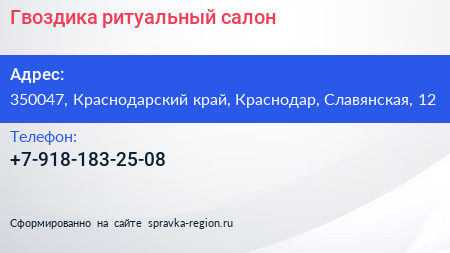 Гвоздика, ритуальный салон по адресу 350047, Краснодарский край, Краснодар, Славянская, 12 в дальнейшем Организация, размещена в следующих категориях:
