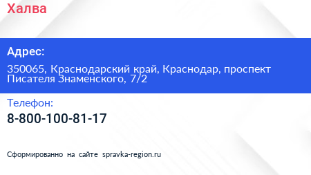 Халва по адресу 350065, Краснодарский край, Краснодар, проспект Писателя Знаменского, 7/2 в дальнейшем Организация, размещена в следующих категориях: