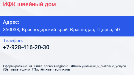 ИФК, швейный дом по адресу 350038, Краснодарский край, Краснодар, Щорса, 50 в дальнейшем Организация, размещена в следующих категориях: