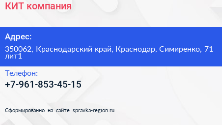 КИТ, компания по адресу 350062, Краснодарский край, Краснодар, Симиренко, 71 лит1 в дальнейшем Организация, размещена в следующих категориях: