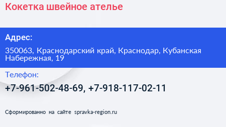 Кокетка, швейное ателье по адресу 350063, Краснодарский край, Краснодар, Кубанская Набережная, 19 в дальнейшем Организация, размещена в следующих категориях: