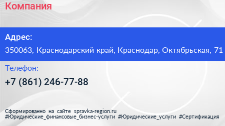 Компания по адресу 350063, Краснодарский край, Краснодар, Октябрьская, 71 в дальнейшем Организация, размещена в следующих категориях: