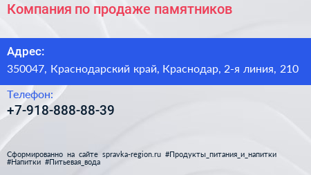 Компания по продаже памятников по адресу 350047, Краснодарский край, Краснодар, 2-я линия, 210 в дальнейшем Организация, размещена в следующих категориях: