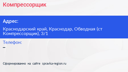 Компрессорщик по адресу Краснодарский край, Краснодар, Обводная (ст Компрессорщик), 3/1 в дальнейшем Организация, размещена в следующих категориях: