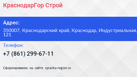 КраснодарГор-Строй по адресу 350007, Краснодарский край, Краснодар, Индустриальная, 121 в дальнейшем Организация, размещена в следующих категориях: