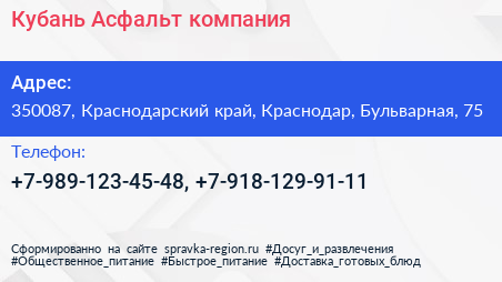 Кубань Асфальт, компания по адресу 350087, Краснодарский край, Краснодар, Бульварная, 75 в дальнейшем Организация, размещена в следующих категориях: