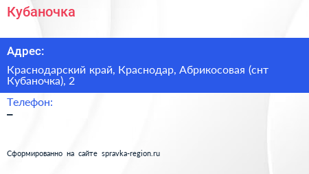 Кубаночка по адресу Краснодарский край, Краснодар, Абрикосовая (снт Кубаночка), 2 в дальнейшем Организация, размещена в следующих категориях: