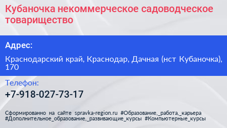 Кубаночка, некоммерческое садоводческое товарищество по адресу Краснодарский край, Краснодар, Дачная (нст Кубаночка), 170 в дальнейшем Организация, размещена в следующих категориях: