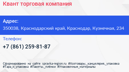 Квант, торговая компания по адресу 350038, Краснодарский край, Краснодар, Кузнечная, 234 в дальнейшем Организация, размещена в следующих категориях:
