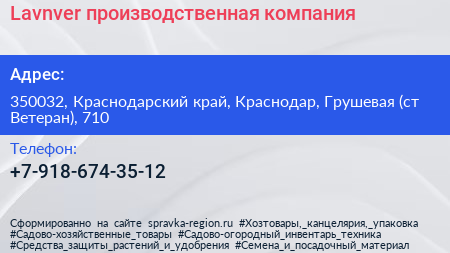 Lavnver, производственная компания по адресу 350032, Краснодарский край, Краснодар, Грушевая (ст Ветеран), 710 в дальнейшем Организация, размещена в следующих категориях: