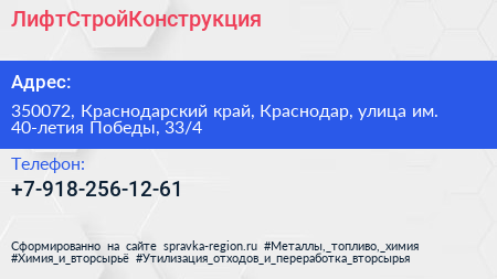 ЛифтСтройКонструкция по адресу 350072, Краснодарский край, Краснодар, улица им. 40-летия Победы, 33/4 в дальнейшем Организация, размещена в следующих категориях: