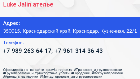 Luke Jalin, ателье по адресу 350015, Краснодарский край, Краснодар, Кузнечная, 22/1 в дальнейшем Организация, размещена в следующих категориях: