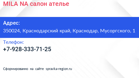 MILA & NA, салон-ателье по адресу 350024, Краснодарский край, Краснодар, Мусоргского, 1 в дальнейшем Организация, размещена в следующих категориях: