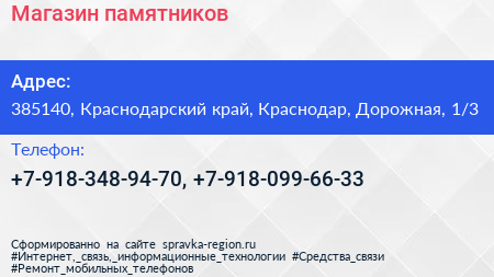 Магазин памятников по адресу 385140, Краснодарский край, Краснодар, Дорожная, 1/3 в дальнейшем Организация, размещена в следующих категориях: