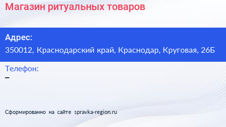 Магазин ритуальных товаров по адресу 350012, Краснодарский край, Краснодар, Круговая, 26Б в дальнейшем Организация, размещена в следующих категориях: