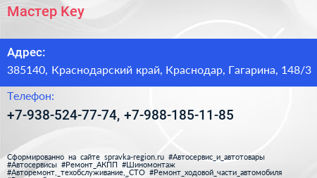 Мастер Key по адресу 385140, Краснодарский край, Краснодар, Гагарина, 148/3 в дальнейшем Организация, размещена в следующих категориях: