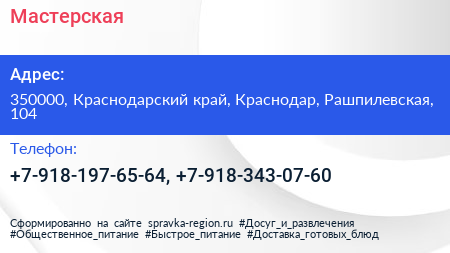 Мастерская по адресу 350000, Краснодарский край, Краснодар, Рашпилевская, 104 в дальнейшем Организация, размещена в следующих категориях: