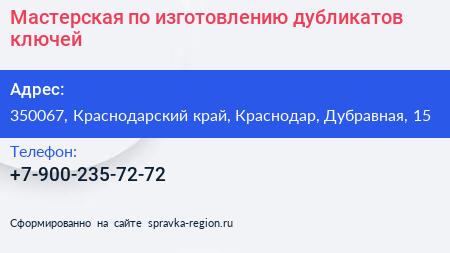Мастерская по изготовлению дубликатов ключей по адресу 350067, Краснодарский край, Краснодар, Дубравная, 15 в дальнейшем Организация, размещена в следующих категориях: