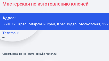 Мастерская по изготовлению ключей по адресу 350072, Краснодарский край, Краснодар, Московская, 122 в дальнейшем Организация, размещена в следующих категориях: