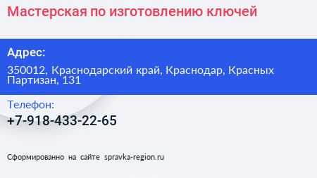 Мастерская по изготовлению ключей по адресу 350012, Краснодарский край, Краснодар, Красных Партизан, 131 в дальнейшем Организация, размещена в следующих категориях: