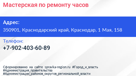 Мастерская по ремонту часов по адресу 350901, Краснодарский край, Краснодар, 1 Мая, 158 в дальнейшем Организация, размещена в следующих категориях: