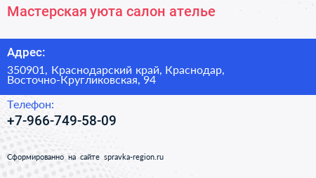 Мастерская уюта, салон-ателье по адресу 350901, Краснодарский край, Краснодар, Восточно-Кругликовская, 94 в дальнейшем Организация, размещена в следующих категориях: