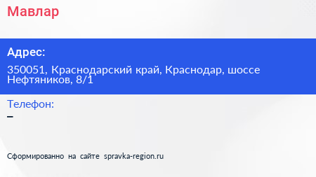 Мавлар по адресу 350051, Краснодарский край, Краснодар, шоссе Нефтяников, 8/1 в дальнейшем Организация, размещена в следующих категориях: