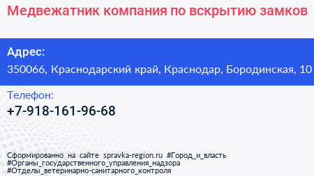 Медвежатник, компания по вскрытию замков по адресу 350066, Краснодарский край, Краснодар, Бородинская, 10 в дальнейшем Организация, размещена в следующих категориях: