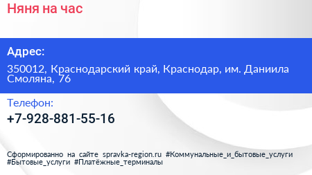 Няня на час по адресу 350012, Краснодарский край, Краснодар, им. Даниила Смоляна, 76 в дальнейшем Организация, размещена в следующих категориях: