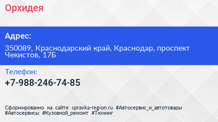 Орхидея по адресу 350089, Краснодарский край, Краснодар, проспект Чекистов, 17Б в дальнейшем Организация, размещена в следующих категориях:
