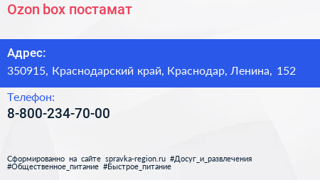 Ozon box, постамат по адресу 350915, Краснодарский край, Краснодар, Ленина, 152 в дальнейшем Организация, размещена в следующих категориях: