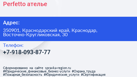 Perfetto, ателье по адресу 350901, Краснодарский край, Краснодар, Восточно-Кругликовская, 30 в дальнейшем Организация, размещена в следующих категориях: