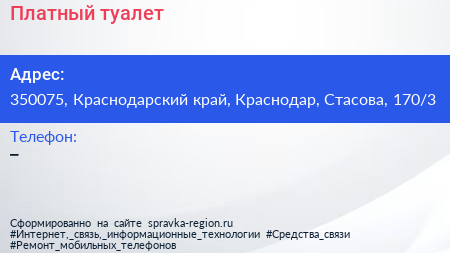 Платный туалет по адресу 350075, Краснодарский край, Краснодар, Стасова, 170/3 в дальнейшем Организация, размещена в следующих категориях: