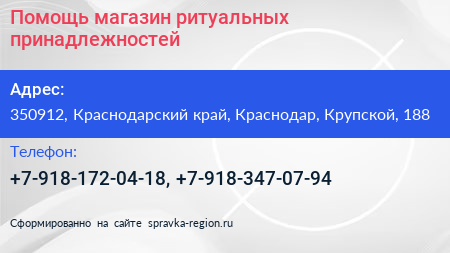 Помощь, магазин ритуальных принадлежностей по адресу 350912, Краснодарский край, Краснодар, Крупской, 188 в дальнейшем Организация, размещена в следующих категориях: