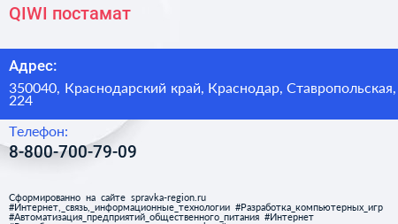 QIWI, постамат по адресу 350040, Краснодарский край, Краснодар, Ставропольская, 224 в дальнейшем Организация, размещена в следующих категориях: