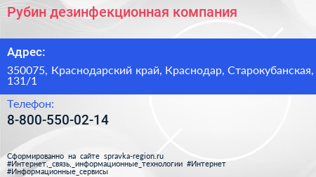 Рубин, дезинфекционная компания по адресу 350075, Краснодарский край, Краснодар, Старокубанская, 131/1 в дальнейшем Организация, размещена в следующих категориях: