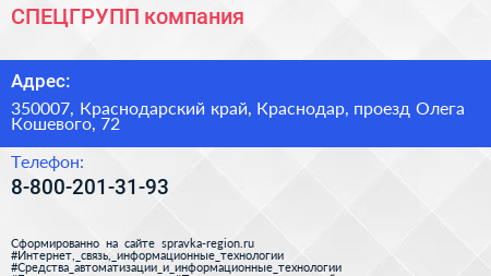СПЕЦГРУПП, компания по адресу 350007, Краснодарский край, Краснодар, проезд Олега Кошевого, 72 в дальнейшем Организация, размещена в следующих категориях: