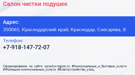 Салон чистки подушек по адресу 350065, Краснодарский край, Краснодар, Снесарева, 8 в дальнейшем Организация, размещена в следующих категориях: