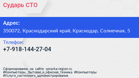 Сударь, СТО по адресу 350072, Краснодарский край, Краснодар, Солнечная, 5 в дальнейшем Организация, размещена в следующих категориях: