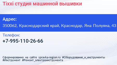 Tixxi, студия машинной вышивки по адресу 350062, Краснодарский край, Краснодар, Яна Полуяна, 43 в дальнейшем Организация, размещена в следующих категориях: